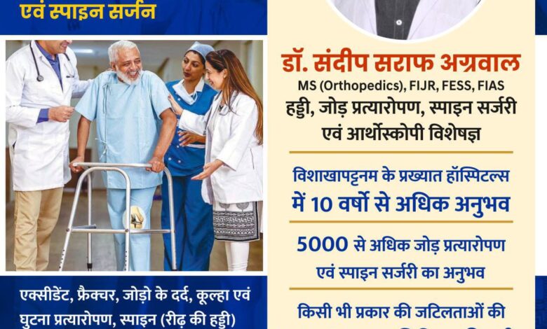 सरायपाली: जिले का एकमात्र हॉस्पिटल अग्रवाल नर्सिंग होम बसना में विशाखापट्टनम के प्रख्यात हॉस्पिटल्स में 10 वर्षों से अधिक अनुभव तथा 5000 से अधिक जोड़ प्रत्यारोपण एवं स्पाइन सर्जरी का अनुभव रखने वाले डॉ. संदीप सराफ अग्रवाल हड्डी, जोड़ प्रत्यारोपण, स्पाइन सर्जरी एवं आर्थोस्कोपी विशेषज्ञ प्रतिदिन उपलब्ध रहेंगे।उनके द्वारा अत्याधुनिक जोड़ प्रत्यारोपण एवं स्पाइन सर्जन,एक्सीडेंट, फ्रैक्चर, जोड़ो के दर्द, कूल्हा एवं घुटना प्रत्यारोपण, रीढ़ की हड्डी संबंधित परेशानी, स्पोर्ट्स इंजुरी, सियाटिका, स्लिप डिस्क, नसों की बीमारियां, लिगामेंट हेतु दूरबीन पद्धति, आर्थोस्कोपी इलाज उपलब्ध है।