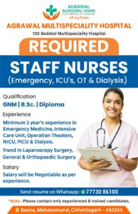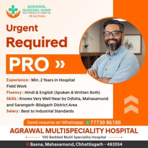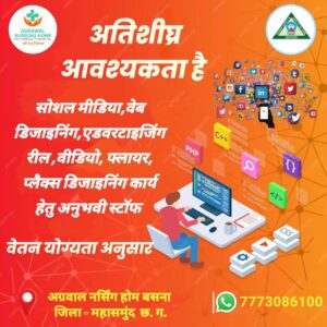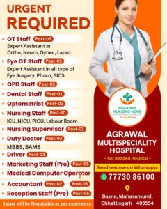 सरायपाली : अग्रवाल मल्टी स्पेशलिटी हॉस्पिटल बसना में विभिन्न पदों पर रोजगार का शुभ अवसर दिया गया है जिसमें अलग-अलग फील्ड के के लिए अलग-अलग जॉब अपनी योग्यता के अनुसार काम कर सके सकते है। जैसे:-सोशल मीडिया, वेब डिजाइनिंग,एडवरटाइजिंग रील, वीडियो, फ्लायर, प्लैक्स डिजाइनिंग कार्य हेतु अनुभवी स्टॉफ़ की आवश्यकता है और इसके अलावा नेत्र रोग ऑपरेशन विभाग कार्य हेतु Ot technician की आवश्यकता है दोनों ही कार्यों में सैलरी योग्यता अनुसार रहेगी केवल अनुभवी ही संपर्क करें और स्टाफ नर्स (आपातकालीन, आईसीयू, ओटी और डायलिसिस) नर्सिंग स्टाफ की जिसकी योग्यता जीएनएम,बीएससी,डिप्लोमा,में हो।
