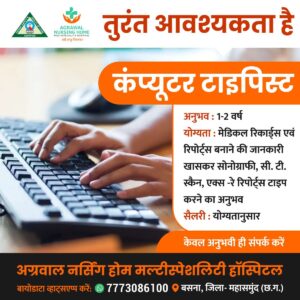 और आपातकालीन चिकित्सा, गहन चिकित्सा इकाई, ऑपरेशन थियेटर, एनआईसीयू, पीआईसीयू और डायलिसिस में न्यूनतम 2 वर्ष का अनुभव हो तथा लैप्रोस्कोपी सर्जरी, सामान्य और आर्थोपेडिक सर्जरी में रुझान हो.वेतन अनुभव के अनुसार दिया जायेगा तथा आवश्यकता है फास्ट कंप्यूटर टाइपिस्ट की। जिसे 1-2 वर्ष अनुभव हो और उसकी योग्यता मेडिकल रिकार्ड्स एवं रिपोर्ट्स बनाने की जानकारी खासकर सोनोग्राफी, सी. टी. स्कैन, एक्स-रे रिपोर्ट्स टाइप करने का अनुभव रखता हो।सैलरी योग्यतानुसार दी जाएगी और जो कोई भी दिए गए पदों पर कार्य को करने हेतु इच्छुक हैं वे अपना बायोडाटा दिए गए नंबर पर भेज सकते हैं।