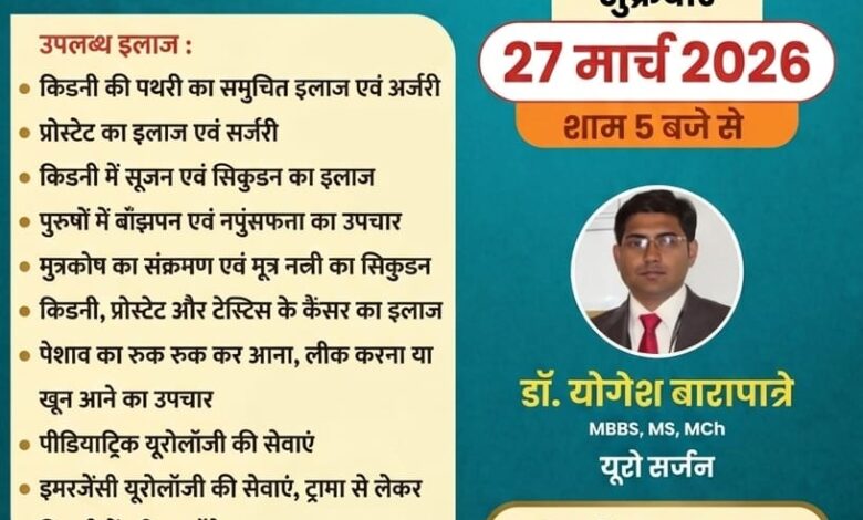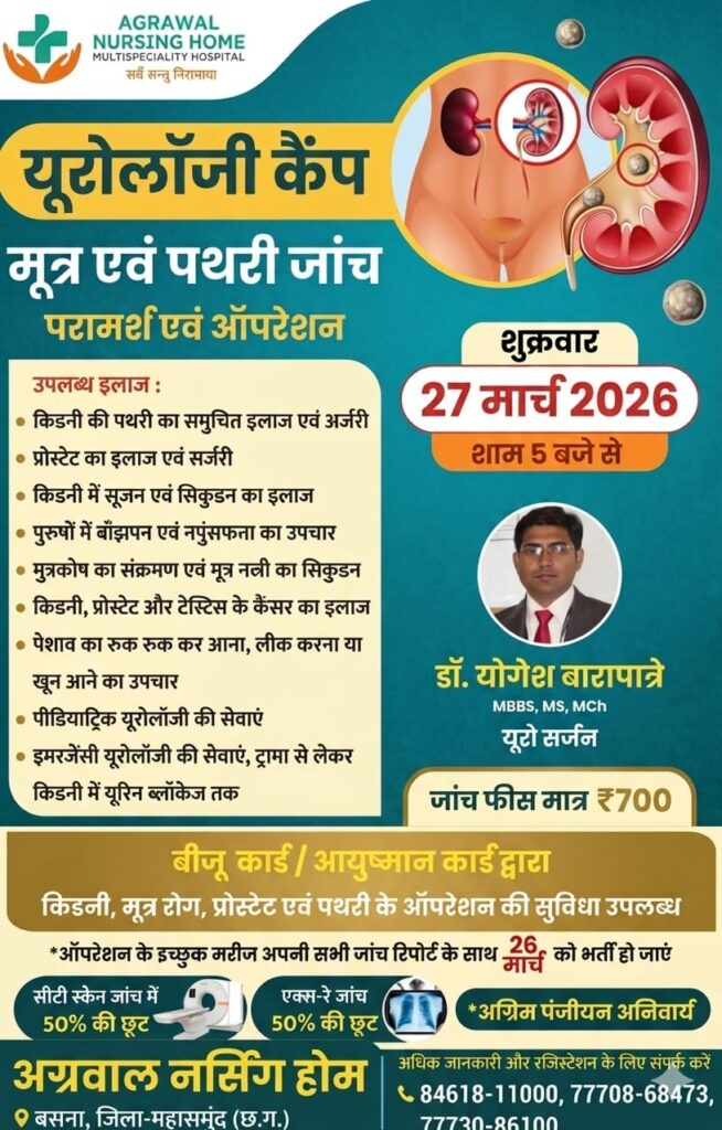 यूरो सर्जन विशेषज्ञ डॉक्टर योगेश बारापात्रे आज 27 मार्च को अग्रवाल नर्सिंग होम बसना में उपलब्ध रहेंगे