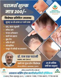 अग्रवाल नर्सिंग होम बसना में में प्रतिदिन सुबह 10 से शाम 07 बजे तक चर्म रोग विशेषज्ञ उपलब्ध रहेंगे