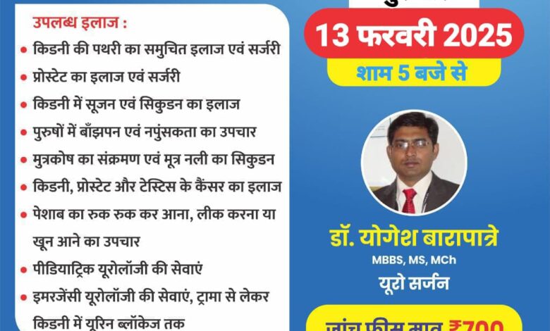 सरायपाली : 13 फरवारी को यूरोसर्जन डॉक्टर योगेश बारापात्रे अग्रवाल नर्सिंग होम बसना के यूरोलॉजी कैंप में शाम 05 बजे से उपस्थित रहेंगे। मूत्र एवं पथरी जांच परामर्श एवं ऑपरेशन के साथ-साथ किडनी पथरी का समुचित इलाज एवं सर्जरी,प्रोस्टेट का इलाज एवं सर्जरी,किडनी में सूजन एवं सिकुड़न का इलाज,पुरुषों में बांझपन एवं नपुंसकता का उपचार, मूत्र कोष का संक्रमण एवं मूत्र नली का सिकुड़न, किडनी प्रोस्टेट और टेस्टिंग के कैंसर का इलाज, पेशाब का रुक-रुक कर आना लीक करना या खून आने का उपचार, पीडियाट्रिक यूरोलॉजी की सेवाएं, इमरजेंसी यूरोलॉजी की सेवाएं ट्रामा से लेकर किडनी में यूरिन ब्लॉकेज तक सभी प्रकार का इलाज डॉक्टर योगेश बारापात्रे द्वारा किया जाता है सिटी स्कैन द्वारा पथरी की सटीक जांच मात्र ₹700 में किडनी प्रोस्टेट एवं पथरी इत्यादि सभी का ऑपरेशन अग्रवाल नर्सिंग होम बसना में किया जाता है एवं प्रतिदिन नि:शुल्क डायलिसिस उपलब्ध आईसीयू बैकअप के साथ।इलाज एवं ऑपरेशन के इच्छुक मरीज इलाज करवाने से पूर्व अपनी सभी पुरानी रिपोर्ट के साथ 13 फरवारी को भर्ती हो जाएं अग्रिम पंजीयन अनिवार्य है अधिक जानकारी के लिए नीचे दिए गए नंबर पर जानकारी दी जा सकती है 7770868473,7773000100,8461811000