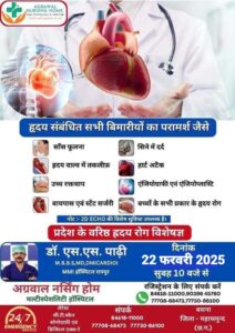 प्रदेश के वरिष्ठ हृदय रोग विशेषज्ञ डॉ. एस. एस. पाढी 22 फरवरी को अग्रवाल नर्सिंग होम बसना में उपलब्ध रहेंगे