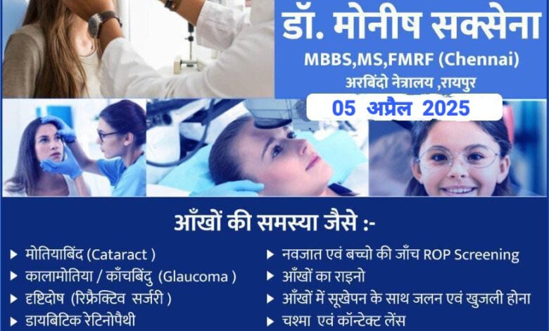 प्रदेश के प्रख्यात नेत्र चिकित्सा एवं उनकी टीम 05 अप्रैल को अग्रवाल नर्सिंग होम बसना में उपलब्ध रहेगी