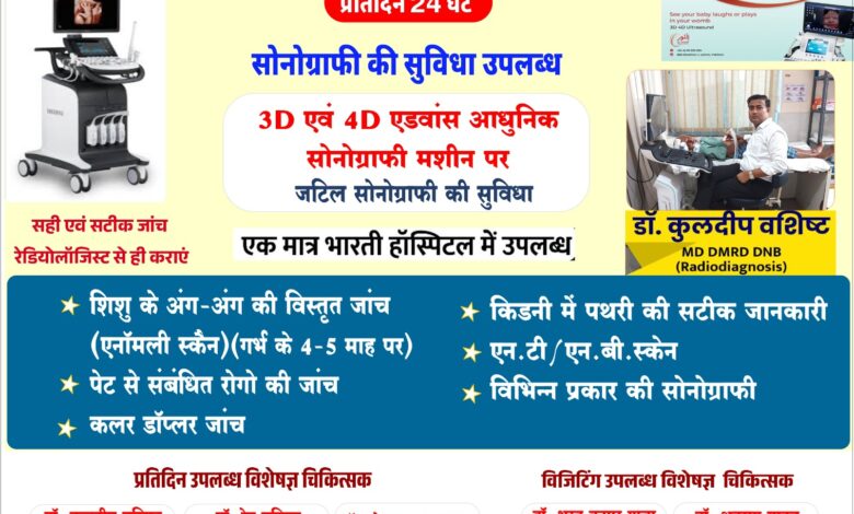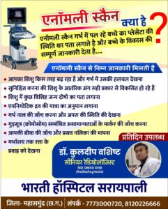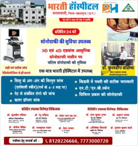 सरायपाली: 10 वर्षों से जनता की सेवा में समर्पित शहर के सर्व सुविधा युक्त अस्पताल भारती हॉस्पिटल सरायपाली में प्रतिदिन 24 घंटे सोनोग्राफी 3D एवं 4D एडवांस आधुनिक सोनोग्राफी मशीन पर जटिल सोनोग्राफी की सुविधा उपस्थित है, एक मात्र भारती हॉस्पिटल में उपलब्ध है।