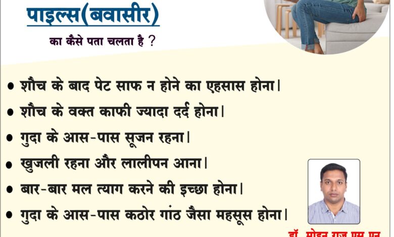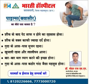 सरायपाली : रायपुर के प्रसिद्ध डॉ.मोहन राज एस.एन. एम.बी.बी.एस.,एम.एस. जनरल एंड लेप्रोस्कोपिक सर्जन पूर्व सीनियर रेजिडेंट, एम्स रायपुर (छ.ग.) के प्रतिदिन भारती हॉस्पिटल सरायपाली में उपलब्ध रहेंगे। उनके द्वारा पाइल्स (बवासीर) से सम्बन्धित रोग जैसे-शौच के बाद पेट साफ न होने का एहसास होना,शौच के वक्त काफी ज्यादा दर्द होना,गुदा के आस-पास सूजन रहना,खुजली रहना और लालीपन आना,बार-बार मल त्याग करने की इच्छा होना,गुदा के आस-पास कठोर गांठ जैसा महसूस होना, इसके अलावा लेप्रोस्कोपिक एवं जनरल सर्जरी से संबंधित दूरबीन द्वारा हर्नियां, पित्त की थैली व अपेंडिक्स का ऑपरेशन,हाईड्रोसिल व हर्निया,बवासीर, फिस्सर व पेट में अल्सर,ब्रेस्ट का ऑपरेशन,
