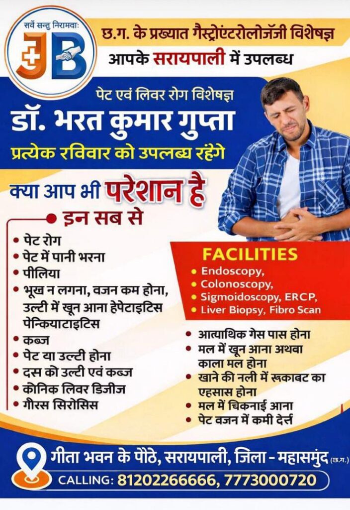 सरायपाली : छ.ग. के प्रख्यात गैस्ट्रोएंटरोलॉजी विशेषज्ञ डॉ भरत कुमार गुप्ता अब प्रत्येक रविवार आपके सरायपाली में उपलब्ध रहेंगे।