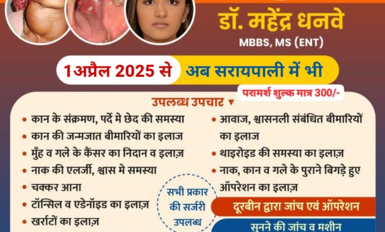 सरायपाली : अब सरायपाली वासियों को इलाज के लिए दूर जाने की आवश्यकता नहीं क्योंकि अब अग्रवाल नर्सिंग होम बसना के सुप्रसिद्ध डॉक्टर, डॉ. महेंद्र धनवे MBBS, MS (ENT) नाक,कान, गला रोग विशेषज्ञ अब प्रत्येक मंगलवार एवं शुक्रवार को अग्रवाल डेंटल एंड पॉलीक्लिनिक सरायपाली में उपलब्ध रहेंगे, जहाँ पर नाक कान गला रोग से संबंधित उपलब्ध उपचार :