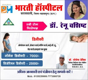 सरायपाली : स्त्री रोग विशेषज्ञ डॉ रेनू विशिष्ट अब प्रतिदिन भारती हॉस्पिटल सरायपाली में उपलब्ध रहेंगे, आपको बता दे स्त्री रोग से संबधित सभी रोगों का निदान काफ़ी कम शुल्क पर भारती हॉस्पिटल में किया जाता है, जहाँ पर डिलीवरी चार्ज: नार्मल डिलीवरी – 7000/- एवं सिजेरियन डिलीवरी – 25000/- जिसमे ऑपरेशन चार्ज, डॉक्टर चार्ज, नर्सिंग चार्ज, आई.सी.यू., बेड चार्ज, दवाइयां सब कुछ समल्लित है, तो देर न कीजिये आज ही संपर्क करें : 8120226666,7773000720