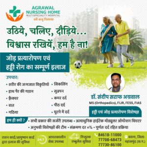 सरायपाली : जिले का एकमात्र हॉस्पिटल अग्रवाल नर्सिंग होम बसना में विशाखापट्टनम के प्रख्यात हॉस्पिटल्स में 10 वर्षों से अधिक अनुभव तथा 5000 से अधिक जोड़ प्रत्यारोपण एवं स्पाइन सर्जरी का अनुभव रखने वाले डॉ. संदीप सराफ अग्रवाल हड्डी, जोड़ प्रत्यारोपण, स्पाइन सर्जरी एवं आर्थोस्कोपी विशेषज्ञ प्रतिदिन उपलब्ध रहेंगे।उनके द्वारा अत्याधुनिक जोड़ प्रत्यारोपण एवं स्पाइन सर्जन,एक्सीडेंट, फ्रैक्चर, जोड़ो के दर्द, कूल्हा एवं घुटना प्रत्यारोपण, रीढ़ की हड्डी संबंधित परेशानी, स्पोर्ट्स इंजुरी, सियाटिका, स्लिप डिस्क, नसों की बीमारियां, लिगामेंट हेतु दूरबीन पद्धति, आर्थोस्कोपी इलाज उपलब्ध है।