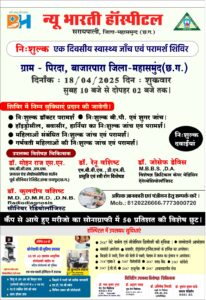 सरायपाली : न्यू भारती हॉस्पिटल सरायपाली के तत्वाधान में निशुल्क एक दिवसीय स्वास्थ्य जांच एवं परामर्श शिविर का आयोजन ग्राम पिरदा बाजारपारा जिला महासमुंद मैं कल दिनांक 18 अप्रैल शुक्रवार को रखा गया था। जिसमें डॉक्टर परामर्श, बीपी एवं शुगर जांच, हाइड्रोसील बवासीर हर्निया का जांच एवं परामर्श, महिलाओं के रोगों से संबंधित जांच, गर्भवती महिलाओं की संपूर्ण जांच एवं परामर्श निःशुल्क किया गया। एवं इसके साथ ही कैंप में आए हुए मरीजों के सोनोग्राफी में 50% की विशेष छूट भी प्रदान की गई, इस शिविर में प्रमुख रूप से डॉ. मोहन राज एस.एन.एम.बी.बी.एस., एम.एस. जनरल एंड लेप्रोस्कोपिक सर्जन पूर्व सीनियर रेजिडेंट, एम्स रायपुर (छ.ग.),डॉ. रेनू वशिष्ट एम.बी.बी.एस., डी.एन.बी. प्रसूति एवं स्त्री रोग विशेषज्ञ,डॉ. कुलदीप वशिष्ट M.D., D.M.R.D., D.N.B. रेडियोड़ीअग्नोसिस, सीनियर रेडियोलॉजिस्ट, डॉ. जोसेफ डेविस M.B.B.S., D.A. विशेषज्ञ क्रिटिकल केयर मेडिसिन ऐनेस्थेसियोलॉजिस्ट एवं साथी बड़ी संख्या में अस्पताल स्टाफ एवं नर्स मरीजों की सुविधा के लिए उपस्थित थे, इस शिविर में न्यू भारती हॉस्पिटल द्वारा लोगों को बीमारियों के जांच निशुल्क परामर्श के साथ-साथ निशुल्क दवाइयां का भी वितरण किया गया।