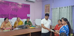 रायपुर : छत्तीसगढ़ राज्य महिला आयोग की अध्यक्ष डॉ. किरणमयी नायक, सदस्यगण मान. सदस्य श्रीमती लक्ष्मी वर्मा, मान. श्रीमती सरला कोसरिया ने आज छत्तीसगढ़ राज्य महिला आयोग के कार्यालय रायपुर में महिला उत्पीड़न से संबंधित प्रकरणों पर सुनवाई की।