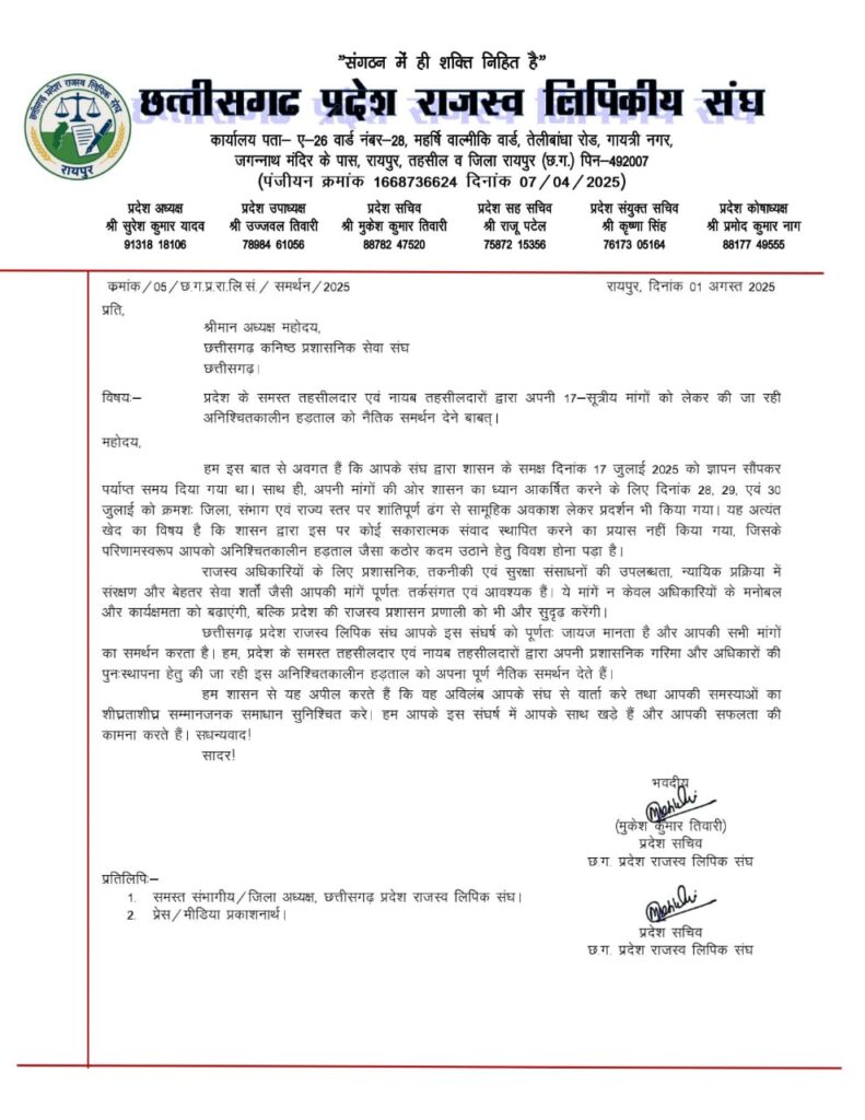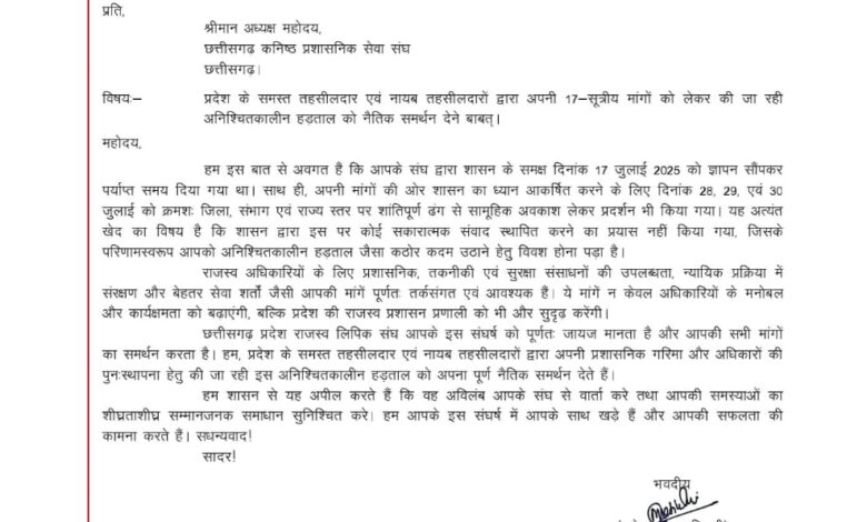 रायपुर : प्रदेश में राजस्व प्रशासन की रीढ़ कहे जाने वाले तहसीलदार और नायब तहसीलदारों की अनिश्चितकालीन हड़ताल ने आज और भी बड़ा रूप ले लिया है। अपनी 17-सूत्रीय मांगों को लेकर हड़ताल पर गए ‘छत्तीसगढ़ कनिष्ठ प्रशासनिक सेवा संघ’ को अब ‘छत्तीसगढ़ प्रदेश राजस्व लिपिक संघ’ का खुला और पूर्ण नैतिक समर्थन मिल गया है। लिपिक संघ के प्रदेश सचिव श्री मुकेश कुमार तिवारी ने कनिष्ठ प्रशासनिक सेवा संघ को एक आधिकारिक पत्र जारी कर न केवल उनके आंदोलन को जायज ठहराया, बल्कि शासन की संवादहीनता पर गहरा खेद भी व्यक्त किया है।