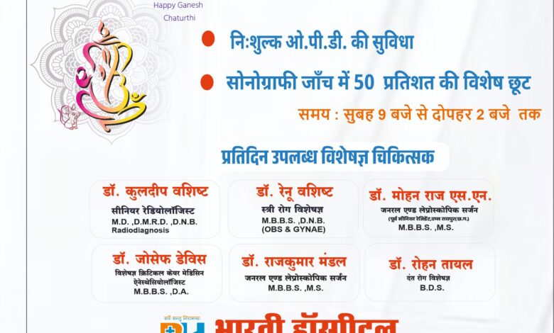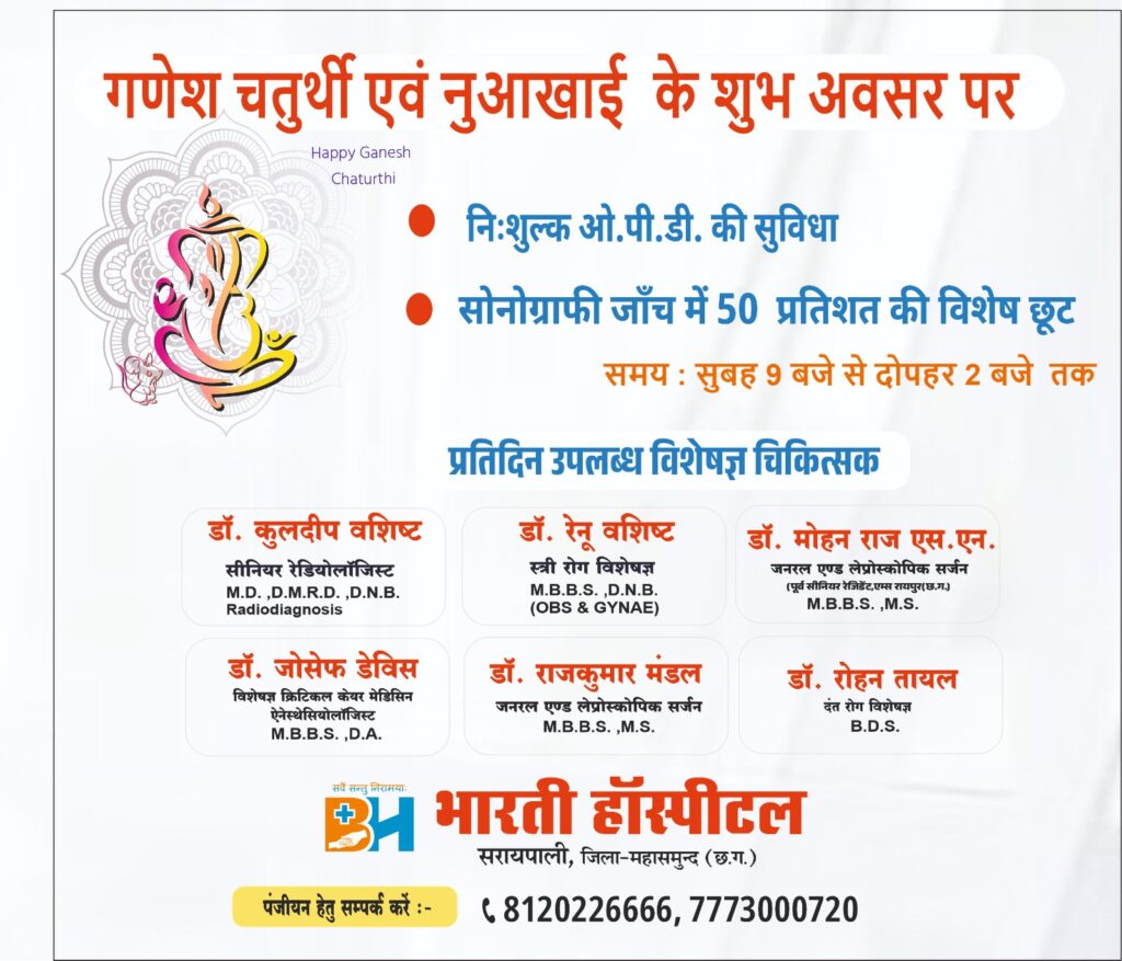 न्यू भारती हॉस्पिटल सरायपाली में गणेश चतुर्थी एवं नुआखाई के शुभ अवसर पर सोनोग्राफी जाँच में 50 प्रतिशत की विशेष छूट और निःशुल्क ओ.पी.डी.की सुविधा