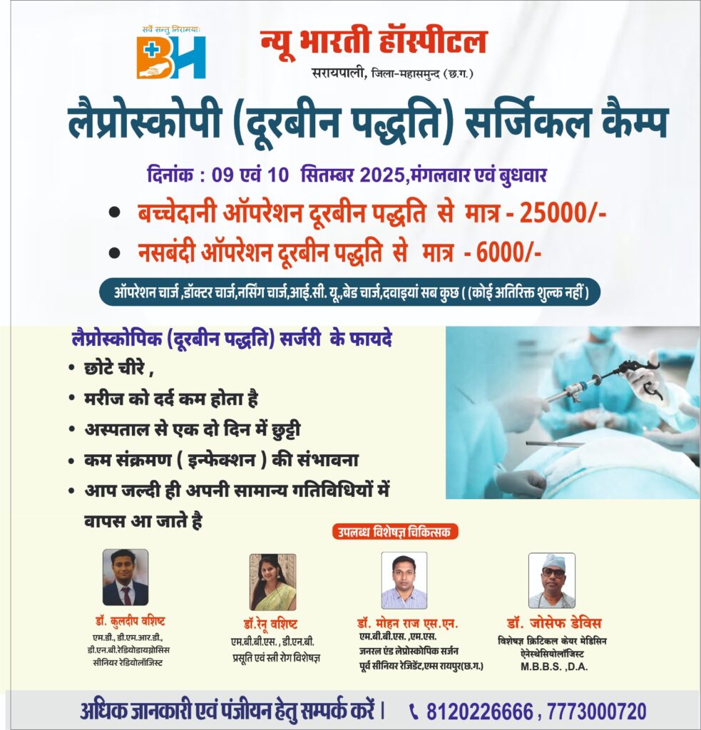 महासमुंद/सरायपाली : लैप्रोस्कोपी (दूरबीन पद्धति) सर्जिकल कैम्प दिनांक का आयोजन दिनांक 09 एवं 10 सितम्बर मंगलवार एवं बुधवार कों न्यू भारती हॉस्पीटल सरायपाली में किया गया है। इस कैंप में बच्चेदानी ऑपरेशन दूरबीन पद्धति से मात्र 30000/-,