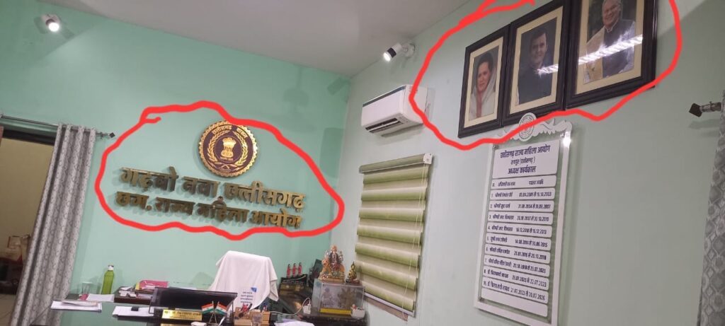 महिला आयोग एक संवैधानिक संस्था है किसी भी शासकीय कार्यालय, संवैधानिक संस्थाओं में प्रधानमंत्री, राष्ट्रपति और संबंधित राज्य के महामहिम राज्यपाल और मुख्यमंत्री का फोटो लगाया जाता है परंतु छत्तीसगढ़ देश का पहला ऐसा राज्य है जहाँ पर महिला आयोग के अध्यक्ष श्रीमती किरणमयी नायक के कक्ष में राहुल गांधी,सोनिया गांधी और भूपेश बघेल का फोटो लगाया गया है जबकि राहुल गांधी और सोनिया गांधी भारत के किसी भी संवैधानिक पद प्रधानमंत्री, राष्ट्रपति, राज्यपाल और मुख्यमंत्री जैसे पद पर नही है फिर भी उनका फ़ोटो शासकीय कार्यालय में लगाना अवैधानिक और लोकतंत्र का घुला उल्लंघन है।