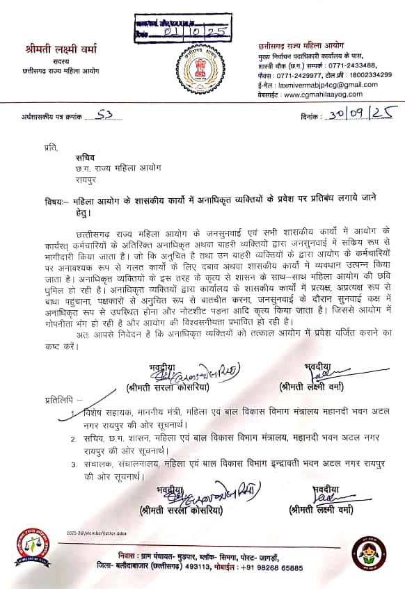 छत्तीसगढ़ राज्य महिला आयोग के अध्यक्ष श्रीमती किरणमयी नायक और सचिव रमेश साहू को आयोग में अनाधिकृत व्यक्तियों के प्रवेश पर प्रतिबंध लगाये जाने हेतु कई बार मौखिक और लिखित पत्र देकर अवगत कराया गया था परंतु अनाधिकृत अथवा बाहरी व्यक्तियों पर प्रतिबंध न लगाकर अध्यक्ष द्वारा अनाधिकृत व्यक्तियों(अध्यक्ष के पति श्रीमान नायक,अखिलेश भारद्वाज,चंद्रिका,सुषमा) को ही नोट शीट में उल्लेखित कर शासकीय कार्यों को सौपा जाता है। अध्यक्ष के प्रसय पर इन अनाधिकृत व्यक्तियों/बाहरी व्यक्तियों द्वारा कार्यालय में सक्रिय रूप से उपस्थित होकर कार्यालय में कार्यरत शासकीय अथवा अर्धशासकीय कर्मचारियों को गलत कार्यों के लिए दवाब अथवा शासकीय कार्य मे व्यवधान उत्पन्न किया जाता है एवं कार्यालयीन कार्यो में हस्तक्षेप और शासकीय दस्तावेजों अथवा केश फ़ाइल को प्रत्यक्ष अथवा अप्रत्यक्ष रूप से प्रभावित किया जाता है साथ ही पक्षकारों से अनुचित बातचीत व सुनवाई कक्ष में अनाधिकृत रूप से उपस्थित होकर शासकीय कार्यों मे दखल दिया जाता है। जिससे महिला आयोग की गोपनीयता और विश्वसनीयता प्रभावित हो रही है।