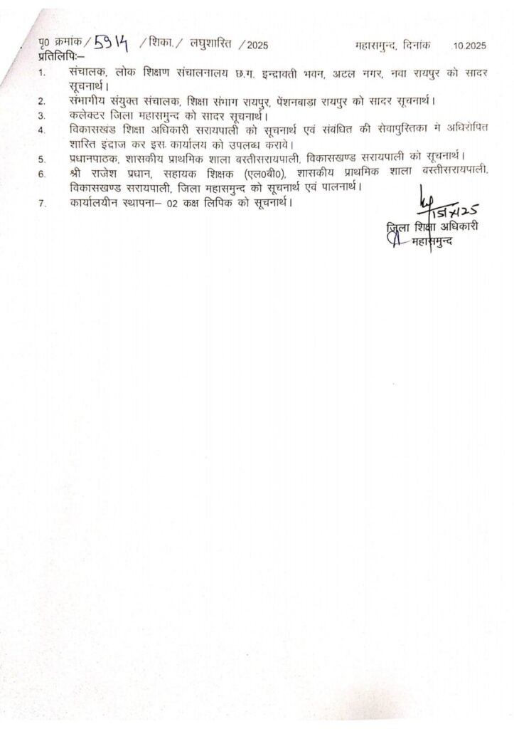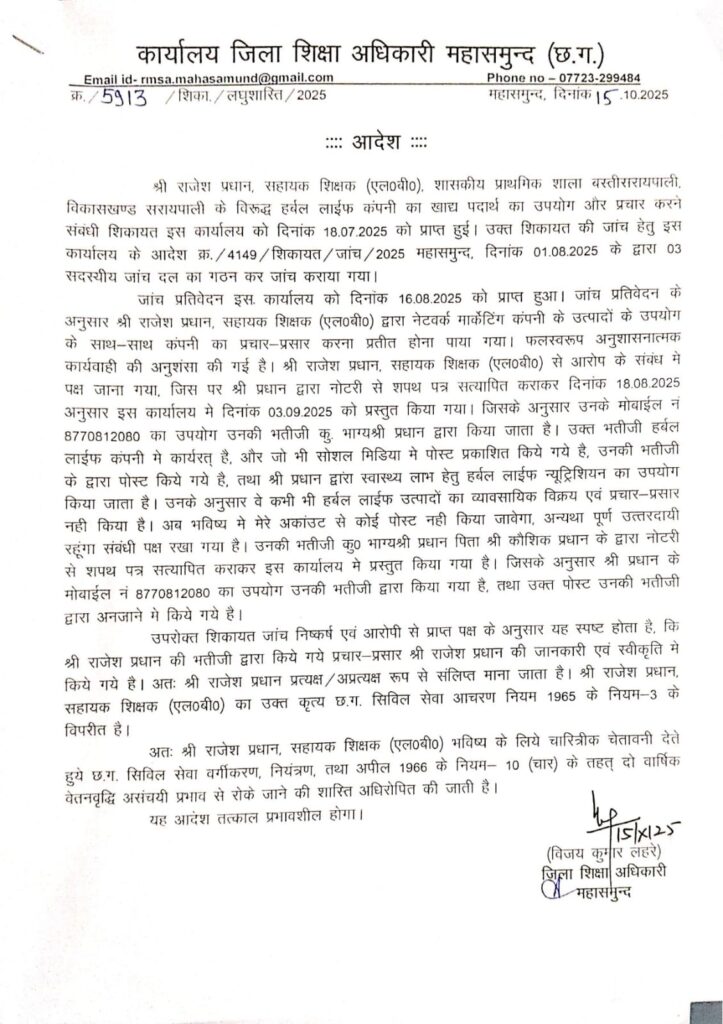 महासमुंद/सरायपाली : बता दें कि अभिनय शाह (पत्रकार) ने दिनांक – 18/07/2025 को जिला शिक्षा अधिकारी महासमुन्द (छ.ग.), संभागीय संयुक्त संचालक शिक्षा संभाग रायपुर (छ.ग.) एवं संचालक लोक शिक्षण संचालनालय छत्तीसगढ़ को इलेक्ट्रानिक साक्ष्य संलग्न करते हुए लिखित शिकायत प्रेषित कर सहायक शिक्षक राजेश प्रधान पदस्थापना शासकीय प्राथमिक शाला बस्ती सरायपाली, (विकासखण्ड सरायपाली) के व्दारा शासकीय कर्मचारी होकर हर्बल लाइफ प्रोडक्ट का व्यापार व प्रचार के विरुद्ध उचित कार्यवाही करने हेतु अनुरोध किया, उक्त सम्बन्ध में कार्यालय जिला शिक्षा अधिकारी महासमुन्द (छ.ग.) के पत्र क्रमांक/4149/शिकायत/जांच/2025 महासमुन्द दिनांक 01/08/2025 के अनुसार जांच दल गठित किया गया, जिसमें प्रकाशचंद मांझी विकासखण्ड शिक्षा अधिकारी सरायपाली, सतीश पटेल विकासखण्ड स्त्रोत समन्यवक सरायपाली, जितेन्द्र रावल व्याख्याता शासकीय हाईस्कूल बाराडोली सरायपाली को नियुक्त किया, जिसमें जांच प्रतिवेदन प्रेषित करने के पश्चात् आज कार्यालय जिला शिक्षा अधिकारी महासमुन्द (छ.ग.) के पत्र क्रमांक/5913/शिका./लघुशास्ति/2025 महासमुन्द दिनांक 15/10/2025 के अनुसार जांच प्रतिवेदन कार्यालय जिला शिक्षा अधिकारी महासमुन्द (छ.ग.) में दिनांक 16/08/2025 को प्राप्त हुआ। जांच प्रतिवेदन के अनुसार राजेश प्रधान, सहायक शिक्षक द्वारा नेटवर्क मार्केटिंग कंपनी के उत्पादों के उपयोग के साथ-साथ कंपनी का प्रचार-प्रसार करना प्रतीत होना पाया गया। फलखवरूप अनुशासनात्मक कार्यवाही की अनुशंसा की गई है। राजेश प्रधान सहायक शिक्षक से आरोप के सम्बन्ध में पक्ष जाना गया था, जिस पर राजेश प्रधान नोटरी से शपथ पत्र सत्यापित कराकर दिनाक 18/08/2025 अनुसार इस कार्यालय में दिनांक 03/09/2025 को प्रस्तुत किया गया। जिसके अनुसार उनके मोबाईल नम्बर 8770812080 का उपयोग उनकी भतीजी द्वारा किया जाता है। उक्त राजेश प्रधान के भतीजी व्दारा उक्त पोस्ट अनजाने में किया गया। उक्त जांच प्रतिवेदन के आधार पर जिला शिक्षा अधिकारी महासमुन्द (छ.ग.) व्दारा राजेश प्रधान के जानकारी एवं स्वीकृति में किए पोस्ट मानते हुए दो वार्षिक वेतन-वृद्धि असंचयी प्रभाव से रोकें जाने हेतु आदेश जारी किया है। जिला शिक्षा अधिकारी महासमुन्द के इस हुए कार्यवाही आदेश में अनेक प्रश्न चिन्ह खड़े हो गए।