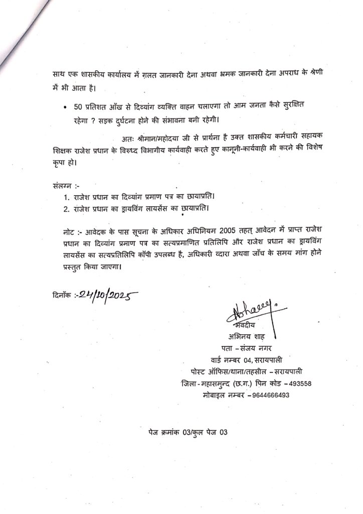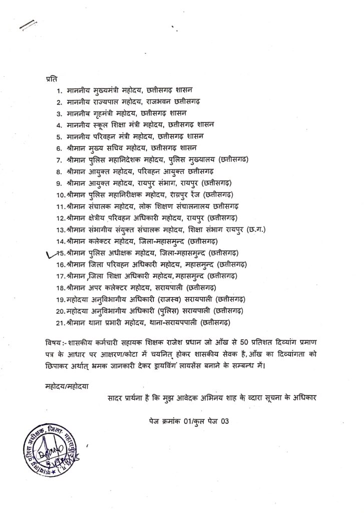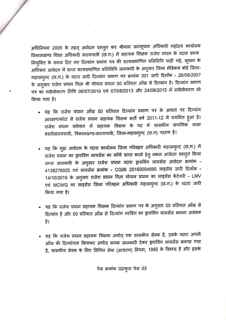 महासमुंद/सरायपाली : मामला जिला महासमुन्द के सरायपाली का है राजेश प्रधान जो सहायक शिक्षक के पद पर शासकीय प्राथमिक शाला बस्तीसरायपाली विकासखण्ड सरायपाली में पदस्थ है। राजेश प्रधान का जिला मेडिकल बोर्ड जिला-महासमुन्द (छ.ग.) के द्वारा जारी 50 प्रतिशत आँख से दिव्यांग प्रमाण पत्र के आरक्षण कोटा में प्रथम नियुक्ति हुआ है, लेकिन 50 प्रतिशत आँख की दिव्यांगता छिपाकर अर्थात् कार्यालय जिला परिवहन अधिकारी महासमुन्द (छ.ग.) भ्रमक जानकारी देकर ड्रायविंग लायसेंस भी बनवा डाला। मामला का खुलासा तब हुआ जब सूचना के अधिकार के तहत् अभिनय शाह ने जब जनसूचना अधिकारी कार्यालय विकासखण्ड शिक्षा अधिकारी सरायपाली को जब राजेश प्रधान सहायक शिक्षक के व्दारा प्रथम नियुक्ति के समय प्रस्तुत दिव्यांग प्रमाण पत्र की सत्यप्रमाणित प्रतिलिपि जानकारी चाहीं गई। जानकारी प्राप्त होने के बाद आवेदक ने कार्यालय जिला परिवहन अधिकारी महासमुन्द (छ.ग.) में राजेश प्रधान का ड्रायविंग लायसेंस का सत्यापित कॉपी के लिए नकल आवेदन दिया, ड्रायविंग लायसेंस का कॉपी मिलने के बाद चौंकाने वाले तथ्य सामने आएं। राजेश प्रधान का दिव्यांग प्रमाण पत्र जिला मेडिकल बोर्ड जिला- महासमुन्द (छ.ग.) के व्दारा जारी दिव्यांग प्रमाण पत्र क्रमांक 301 जारी दिनाँक – 26/06/2007 के अनुसार राजेश प्रधान पिता श्री गोपाल प्रधान 50 प्रतिशत आँख से दिव्यांग है। दिव्यांग प्रमाण पत्र का नवीनीकरण तिथि 06/07/2010 एवं 07/08/2013 और 24/08/2015 में नवीनीकरण भी किया गया है। राजेश प्रधान के द्वारा आँख से 50 प्रतिशत दिव्यांग प्रमाण पत्र का लाभ लेकर दिव्यांग आरक्षण कोटा से सहायक शिक्षक भर्ती वर्ष 2011-12 में चयनित हुआ है। राजेश प्रधान वर्तमान में सहायक शिक्षक के पद में शासकीय प्राथमिक शाला बस्तीसरायपाली, विकासखण्ड-सरायपाली, जिला-महासमुन्द (छ.ग) पदस्थ है। राजेश प्रधान व्दारा ड्रायविंग लायसेंस आवेदन क्रमांक – 4138276925 एवं लायसेंस क्रमांक – CG06 20160004695 लाइसेंस जारी दिनाँक – 14/10/2016 के अनुसार राजेश प्रधान पिता गोपाल प्रधान का लाइसेंस कैटेगरी – LMV एवं MCWG का लाइसेंस जिला परिवहन अधिकारी महासमुन्द (छ.ग.) के व्दारा जारी किया गया है। शिकायतकर्ता ने इस सम्बन्ध में परिवहन विभाग से जानकारी पता किया तो पता चला कि 50 प्रतिशत दिव्यांग आँख व्यक्ति का ड्रायविंग लायसेंस बनना संभव ही नहीं है, इससे यह स्पष्ट होता है कि राजेश प्रधान सहायक शिक्षक ने ड्रायविंग लायसेंस बनाते समय स्वयं घोषणा पत्र (जो ड्रायविंग लायसेंस बनाते समय फार्म भरना पड़ता है) में अपनी दिव्यांगता को छिपाई है अर्थात् परिवहन विभाग को भ्रमक जानकारी देकर ड्रायविंग लायसेंस बनवाया है। दिव्यांग प्रमाण पत्र की छायाप्रति और ड्रायविंग लायसेंस का छायाप्रति संलग्न कर म