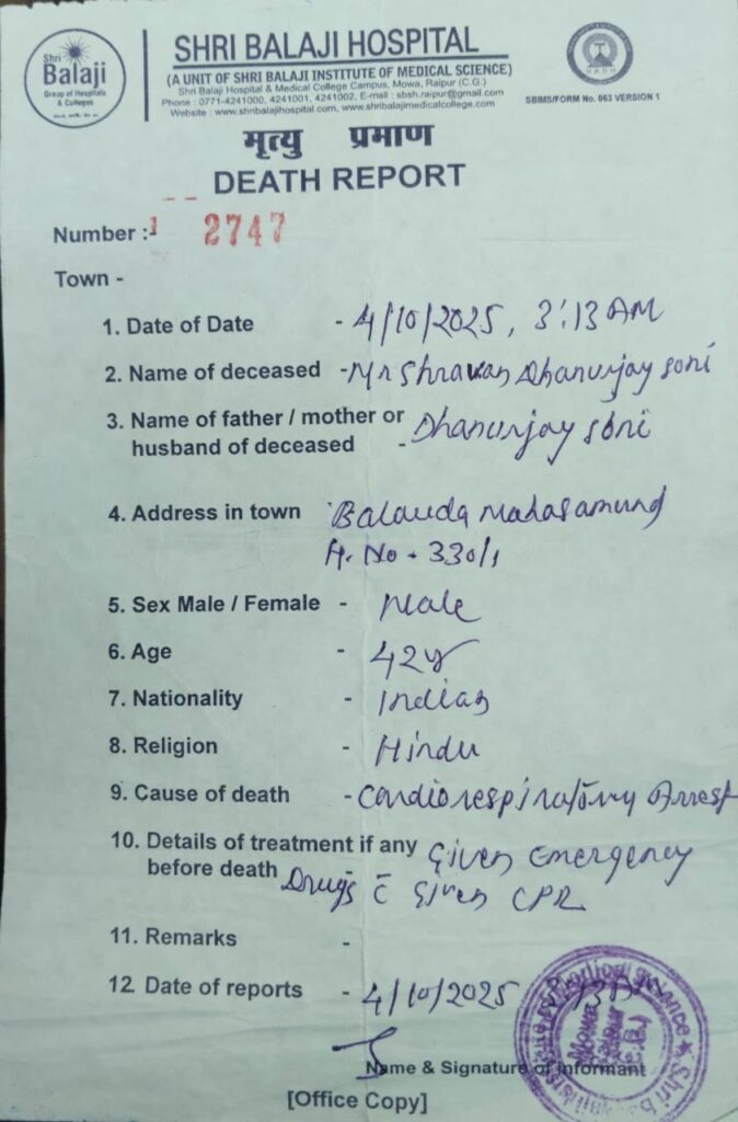 > “तीनों मृतकों के मृत्यु प्रमाण पत्र ग्राम पंचायत बलौदा से जारी किए जा चुके हैं। इनमें से एक व्यक्ति का प्रमाण पत्र श्री बालाजी हॉस्पिटल, रायपुर से प्राप्त हुआ है, जिसमें स्पष्ट उल्लेख है कि मृत्यु ‘Cardio Respiratory Arrest (हृदय गति रुकने)’ से हुई है।