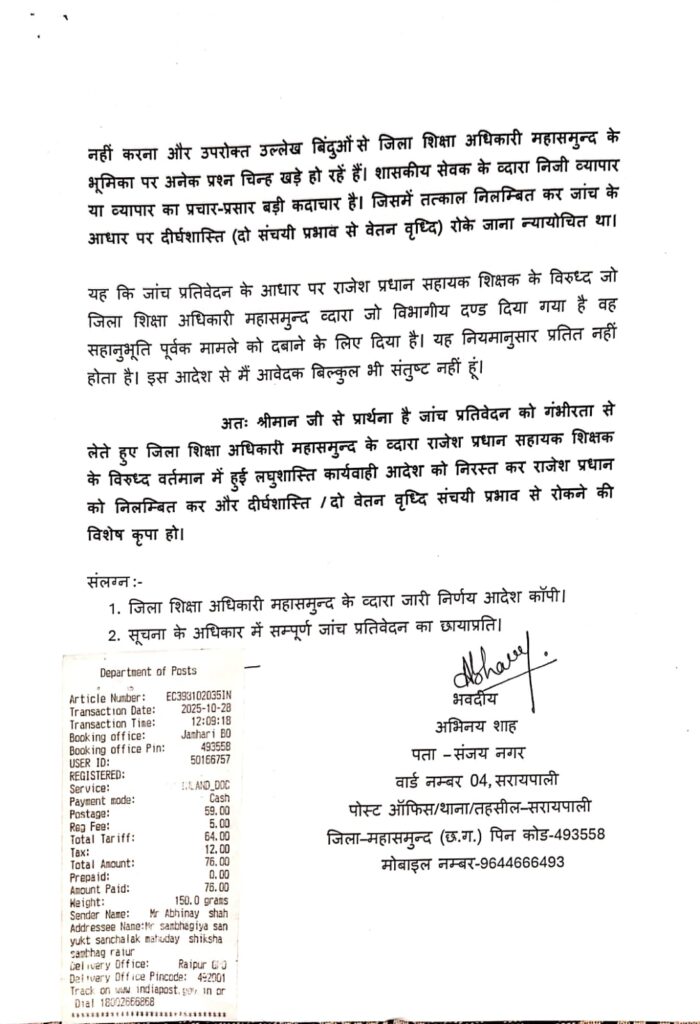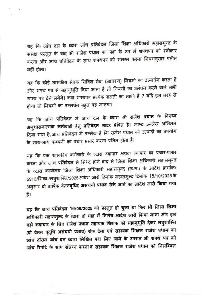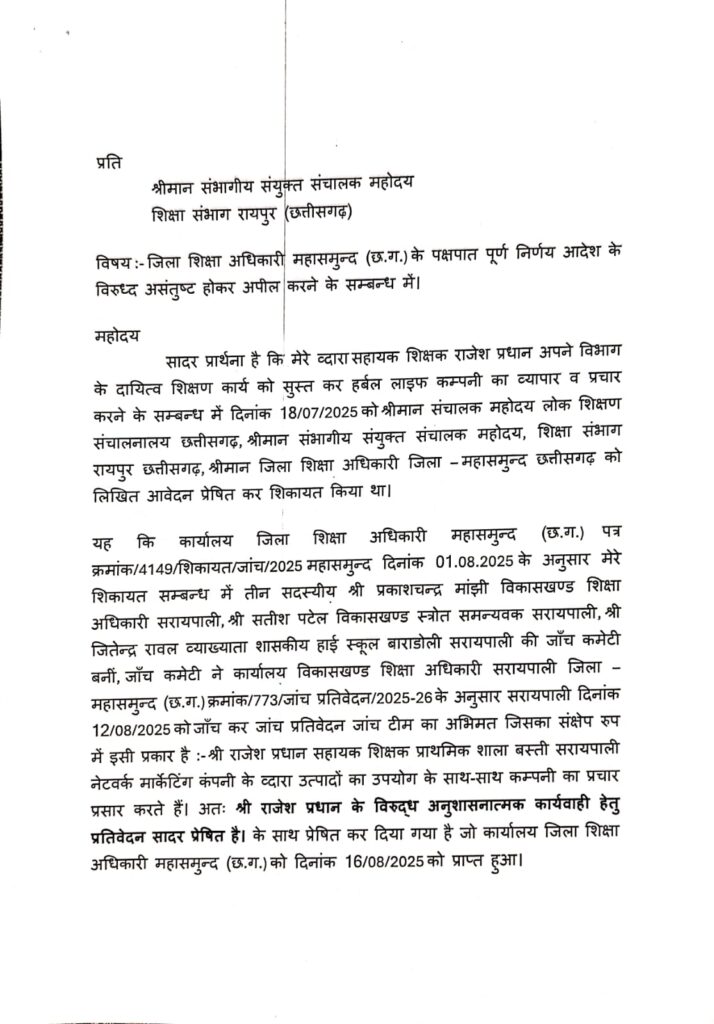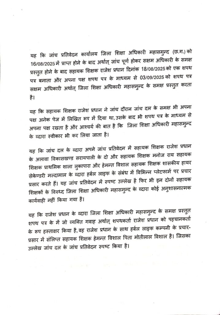 महासमुंद/सरायपाली : महासमुंद जिले सबसे ज्यादा सुर्खियां बटोरने वाला मामला विकासखण्ड सरायपाली में स्थित शासकीय प्राथमिक शाला बस्ती सरायपाली में पदस्थ सहायक शिक्षक राजेश प्रधान का है, मामले में नया मोड़ आ गया है। अपने विभाग के दायित्व शिक्षण कार्य सुस्त कर हर्बल लाइफ कम्पनी का व्यापार व प्रचार करने के सम्बन्ध में दिनांक 18/07/2025 को शिकायतकर्ता अभिनय शाह ने संचालक लोक शिक्षण संचालनालय छत्तीसगढ़, संभागीय संयुक्त संचालक शिक्षा संभाग रायपुर छत्तीसगढ़ एवं जिला शिक्षा अधिकारी महासमुन्द (छ.ग.) को विभागीय उचित कार्यवाही करने हेतु लिखित आवेदन प्रेषित किया था। इसी शिकायत के संदर्भ में कार्यालय जिला शिक्षा अधिकारी महासमुन्द (छ.ग.) के पत्र क्रमांक/4149/शिकायि/जांच/2025 जारी दिनांक महासमुन्द दिनांक 01.08.2025 के अनुसार तीन सदस्यीय जांच दल जिसमें प्रकाशचन्द्र मांझी विकासखण्ड शिक्षा अधिकारी सरायपाली, सतीश पटेल विकासखण्ड स्त्रोत समन्वयक सरायपाली, जितेन्द्र रावल व्याख्याता हाई स्कूल बाराडोली सरायपाली की जांच कमेटी बनाई गई। जांच कमेटी ने कार्यालय विकासखण्ड शिक्षा अधिकारी सरायपाली जिला –महासमुन्द (छ.ग.) के पत्र क्रमांक/773/जांच प्रतिवेदन/2025-26 जारी दिनांक सरायपाली दिनांक 12/08/2025 के अनुसार जांच कर जांच प्रतिवेदन जांच टीम का अभिमत जिसका संक्षेप रुप में इसी प्रकार है :- श्री राजेश प्रधान सहायक शिक्षक प्राथमिक शाला बस्ती सरायपाली नेटवर्क मार्केटिंग कंपनी के व्दारा उत्पादों का उपयोग के साथ-साथ कम्पनी का प्रचार प्रसार करते हैं। अतः श्री राजेश प्रधान के विरुद्ध अनुशासनात्मक कार्यवाही हेतु हेतु प्रतिवेदन सादर प्रेषित है। उल्लेख के साथ जांच प्रतिवेदन प्रेषित कर दिया गया है जो कार्यालय जिला शिक्षा अधिकारी महासमुन्द (छ.ग.) को दिनांक 16/082025 को प्राप्त हुआ है। जांच प्रतिवेदन प्रस्तुत लगभग दो माह तक राजेश प्रधान के विरुद्ध कोई अनुशासनात्मक कार्यवाही नहीं हुआ लगभग दो माह में लघुशास्ति अर्थात् विभागीय कम सजा या छोटा सजा के रूप में कार्यालय जिला शिक्षा अधिकारी महासमुन्द (छ.ग.) के आदेश क्रमांक/ 5913/शिका./लघुशास्ति/2025 आदेश जारी दिनांक महासमुन्द दिनांक 15/10/2025 के अनुसार दो वार्षिक वेतनवृध्दि असंचयी (अस्थाई रूप से जो बाद में दो साल बाद जुड़ जाता है) प्रभाव रोके जाने का आदेश जारी किया गया है। इस विभागीय सजा से असंतुष्ट होकर शिकायत अभिनय शाह ने महामहिम राष्ट्रपति भारत सरकार, माननीय प्रधानमंत्री भारत सरकार, स्कूल शिक्षा मंत्री छत्तीसगढ़ शासन, सचिव स्कूल शिक्षा विभाग छत्तीसगढ़ शासन, संचालक लोक शिक्षण संचालनालय छत्तीसगढ़, आयुक्त रायपुर संभाग रायपुर, संभागीय संयुक्त संचालक शिक्षा संभाग रायपुर, कलेक्टर जिला महासमुन
