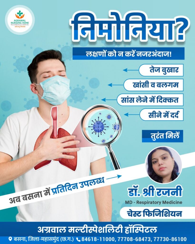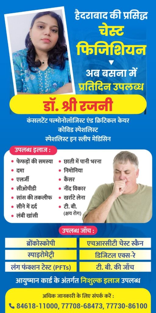 शिविर में निम्न रोगों का परामर्श निःशुल्क एवं जाँच में 30% छूट की सुविधा उपलब्ध होगी। लम्बी खाँसी, टीबी, छाती में दर्द, साँस लेने में तकलीफ़, अस्थमा, दमा एलर्जी, इंओसिनोफिलिया, छाती में पानी भरना, खरटि, नींद से जुड़ी समस्याएँ (स्लिप ऐपनिया), विशेष सुविधा के रूप में सीटी स्केन, ब्रांकोस्कोपी, एक्सरे एवं खून की जाँच पर 30% छूट भी दी जाएगी। शिविर का समयः सुबह 10 से दोपहर 3 बजे तक अग्रवाल नर्सिंग होम, बसना में आयोजित है। अधिक जानकारी के लिए 7773086100, 9303623130 पर संपर्क कर सकते हैं।