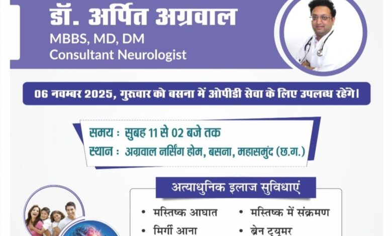 महासमुंद/बसना : रामकृष्ण केयर हॉस्पिटल रायपुर एवं अग्रवाल नर्सिंग होम बसना के संयुक्त तत्वाधान द्वारा आयोजित मस्तिष्क रोग जांच परामर्श ओपीडी सेवाएं जिसमें डॉक्टर अर्पित अग्रवाल MBBS, MD, DM Consultant Neurologist 06 नवंबर 2025 दिन गुरुवार को बसना में ओपीडी सेवा के लिए उपलब्ध रहेंगे।