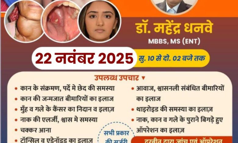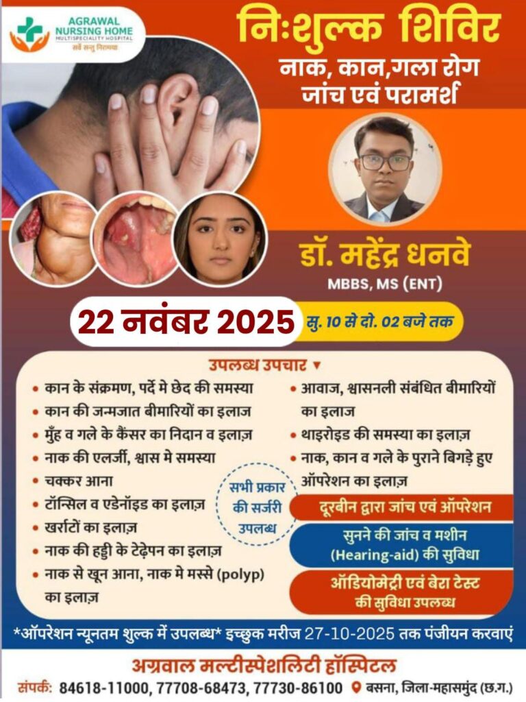 सरायपाली/बसना : 22 नवंबर 2025 सुबह 10 से दोपहर 02 बजे तक अग्रवाल नर्सिंग होम बसना में नाक, कान, गला रोग जांच एवं परामर्श सबंधी निःशुल्क शिविर का आयोजन किया जा रहा है जिसमे डॉ. महेंद्र धनवे MBBS, MS (ENT) उपलब्ध रहेंगे।