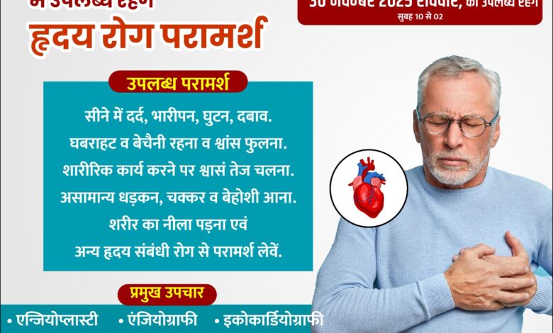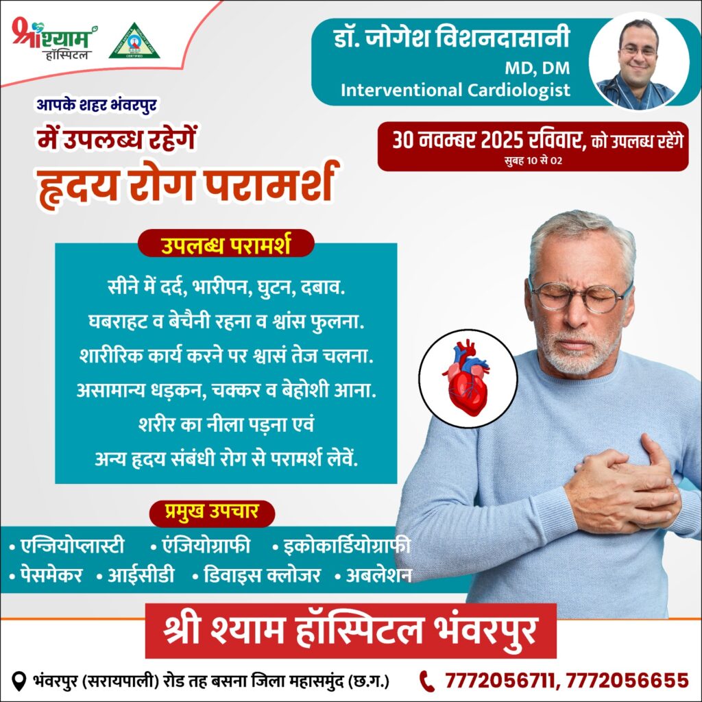 सरायपाली/भॅवरपूर : अब पाएं हृदय से जुड़ी समस्याओं का ईलाज आपके शहर भंवरपुर में डॉ.जोगेश विशनदासानी(MBBS, MD, DM (Cardiology) Interventional Cardiologist & Physician)के द्वारा और दिल के सवालों का सही जवाब, हमारे हृदय रोग विशेषज्ञ के पास तथा अब पाएं हृदय से जुड़ी समस्याओं का ईलाज आपके शहर भंवरपुर में 30 नवम्बर 2025 (रविवार) सुबह 10 बजे से उपलब्ध रहेंगे। स्थानः- श्री श्याम हॉस्पिटल भंवरपुर में।
