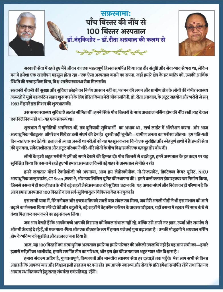उन्होंने आगे कहा कि इस लंबी यात्रा में मेरे मनोबल और इच्छा शक्ति को सबसे बड़ा संबल तब मिला जब मेरी अगली पीढ़ी में भी इस मशाल को आगे बढ़ने का फैसला किया मेरे दो बेटों और बहू ने बड़े शहरों में बेहतरीन करियर के अवसर को छोड़कर यही बसना में रहकर मेरे साथ कंधे से कंधा मिलाकर काम करने का दृढ संकल्प लिया। एवं उनकी मौजूदगी ने अग्रवाल नर्सिंग होम के भविष्य को सुरक्षित और उज्ज्वल बना दिया उन्होंने आज इस 100 बिस्तरों का अत्याधुनिक अस्पताल को हजारों मरीजों का आशीर्वाद, क्षेत्र की जनता का अटूट प्यार और विश्वास एवं अपने और अपने परिवार की परिश्रम को दिया।