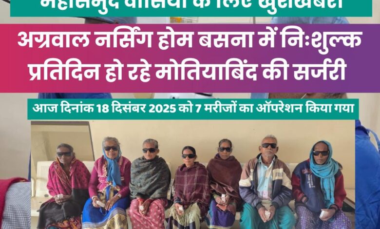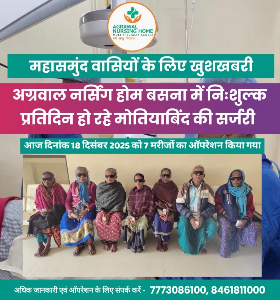 महासमुंद/बसना : एक और जहां मोतियाबिंद के मरीज अपने सफल इलाज के लिए सही अस्पताल का चुनाव करना एवं पैसों के लिए दर बतर भटकना पड़ता है। ठीक उसी के विपरीत महासमुंद जिले के रह वासियों के लिए महासमुंद जिले में स्थित बसना ब्लॉक अंतर्गत अग्रवाल नर्सिंग होम बसना में प्रतिदिन मोतियाबिंद की निशुल्क सर्जरी एवं संपूर्ण इलाज का खर्च शासन की ओर से वहन शासन की ओर से वहां किया जा रहा है किया जा रहा है, आपको बताते चलेगी अग्रवाल नर्सिंग होम बसना शान द्वारा अधिकृत अस्पताल है जहां पर मोतियाबिंद से जुड़ी समस्याओं का संपूर्ण इलाज एक ही छत के नीचे होती है, इसके साथ ही यहां पर मरीज का सर्जरी संबंधी संपूर्ण खर्च, दवाइयां का खर्च, घर से आने-जाने का खर्च, अस्पताल में खाने का खर्च आदि पूर्णता निशुल्क है, तो देर ना करें आज ही संपर्क करें अग्रवाल नर्सिंग होम बसना जिला महासमुंद छत्तीसगढ़ एवं कराए अपना सफल इलाज पूर्णता: निशुल्क अधिक जानकारी एवं ऑपरेशन के लिए संपर्क करें:-