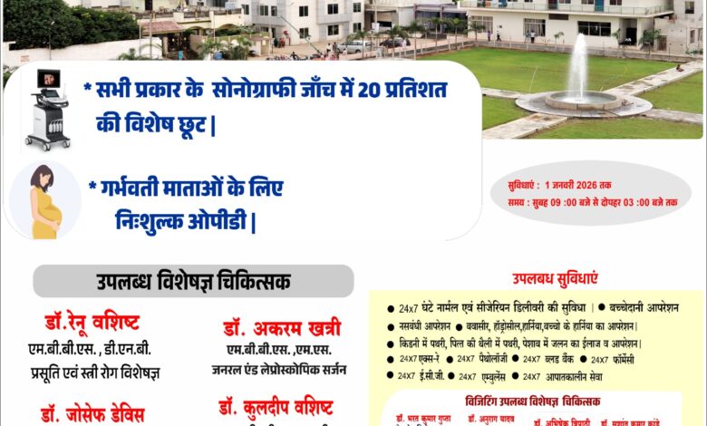 सरायपाली : क्रिसमस एवं न्यू वर्ष के अवसर पर न्यू भारती हॉस्पिटल द्वारा सभी प्रकार के सोनोग्राफी जाँच में 20 प्रतिशत की विशेष छूट दिया गया है तथा गर्भवती माताओं के लिए निःशुल्क ओपीडी की भी सुविधा दी गई है। यहां पर उपलब्ध विशेषज्ञ चिकित्सक:- डॉ.रेनू वशिष्ट (एम.बी.बी.एस., डी.एन.बी. प्रसूति एवं स्त्री रोग विशेषज्ञ),डॉ.जोसेफ डेविस विशेषज्ञ (क्रिटिकल केयर मेडिसिन ऐनेस्थेसियोलॉजिस्ट M.B.B.S., D.A.), डॉ.अकरम खत्री (एम.बी.बी.एस., एम.एस.जनरल एंड लेप्रोस्कोपिक सर्जन), डॉ.कुलदीप वशिष्ट (एम.डी., डी.एम.आर.डी., डी.एन.बी. रेडियोडायग्नोसिस सीनियर रेडियोलॉजिस्ट) विशेषज्ञ उपस्थित रहेंगे। समय का ध्यान रहे यह सुविधाएं केवल 1 जनवरी सुबह 09:00 बजे से दोपहर 03:00 बजे तक मान्य है, उनके द्वारा उपलब्ध सुविधाएं:- 24×7 घंटे नार्मल एवं सीजेरियन डिलीवरी की सुविधा,बच्चेदानी आपरेशन,नसबंधी आपरेशन,बवासीर, हॉड्रोसील, हार्निया, बच्चो के हार्निया का आपरेशन,किडनी में पथरी, पित्त की थैली में पथरी, पेशाब में जलन का ईलाज व आपरेशन,24×7 एक्स-रे,24×7 पैथोलॉजी,24×7 ब्लड बैंक 24×7 ई.सी.जी.,24×7 एम्बुलेंस,24×7 आपातकालीन सेवा,24×7 फॉर्मेसी, सुविधा दी गई है और विजिटिंग उपलब्ध विशेषज्ञ चिकित्सक-डॉ.भरत कुमार गुप्ता पेट रोग विशेषज्ञ (M.B.B.S.M.D. D.M.),डॉ.अनुराग यादव (सूत्र रोग विशेषज्ञ Urologist)डॉ.अभिषेक त्रिपाठी हड्डी रोग विशेषज (MBBS, MS. (ऑपिडिक),डॉ.सुशांत कुमार कांडे जनरल मेडिसीन (M.B.BS. MO) भी शामिल रहेंगे। सोनोग्राफी जांच एवं ओपीडी संबंधी जानकारी के लिए नीचे दिए गए नंबर पर संपर्क कर सकते हैं।बेहतर सलाह और सही उपचार के लिए आज ही संपर्क करें