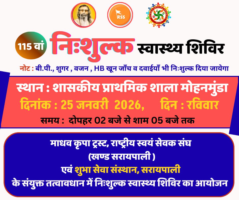 महासमुंद/सरायपाली : माधव कृपा ट्रस्ट, राष्ट्रीय स्वयंसेवक संघ (खंड सरायपाली) एवं शुभा सेवा संस्थान सरायपाली के संयुक्त तत्वाधान में निशुल्क स्वास्थ्य शिविर का आयोजन दिनांक 25 ज़नवरी 2026, दिन- रविवार, स्थान :- शासकीय प्राथमिक शाला मोहनमुड़ा, विकासखंड:- सरायपाली जिला- महासमुंद में आयोजित है। जहां पर विभिन्न रोगों का जांच किया जाएगा साथ ही बी.पी., शुगर, वजन, HB खून जांच व दवाइयां भी निशुल्क प्रदान की जाएगी।
