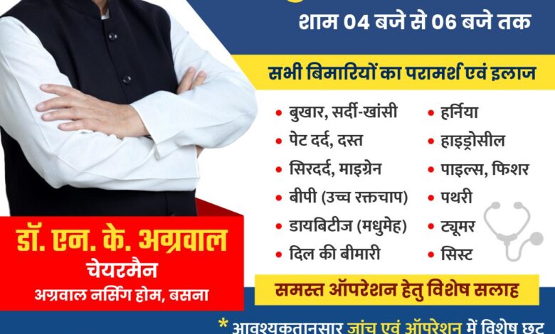 महासमुंद/बसना : एक स्वस्थ समाज के निर्माण और ‘नर सेवा ही नारायण सेवा’ के ध्येय को चरितार्थ करते हुए, छत्तीसगढ़ के प्रतिष्ठित चिकित्सा संस्थान अग्रवाल मल्टीस्पेशलिटी हॉस्पिटल (अग्रवाल नर्सिंग होम), बसना ने मानवता की सेवा में एक अनुकरणीय पहल की है। अस्पताल के चेयरमैन और ख्याति प्राप्त चिकित्सक डॉ. एन. के. अग्रवाल के मार्गदर्शन में अब मरीजों को 45 वर्षों के दीर्घकालीन अनुभव का लाभ निःशुल्क परामर्श के रूप में प्राप्त होगा।