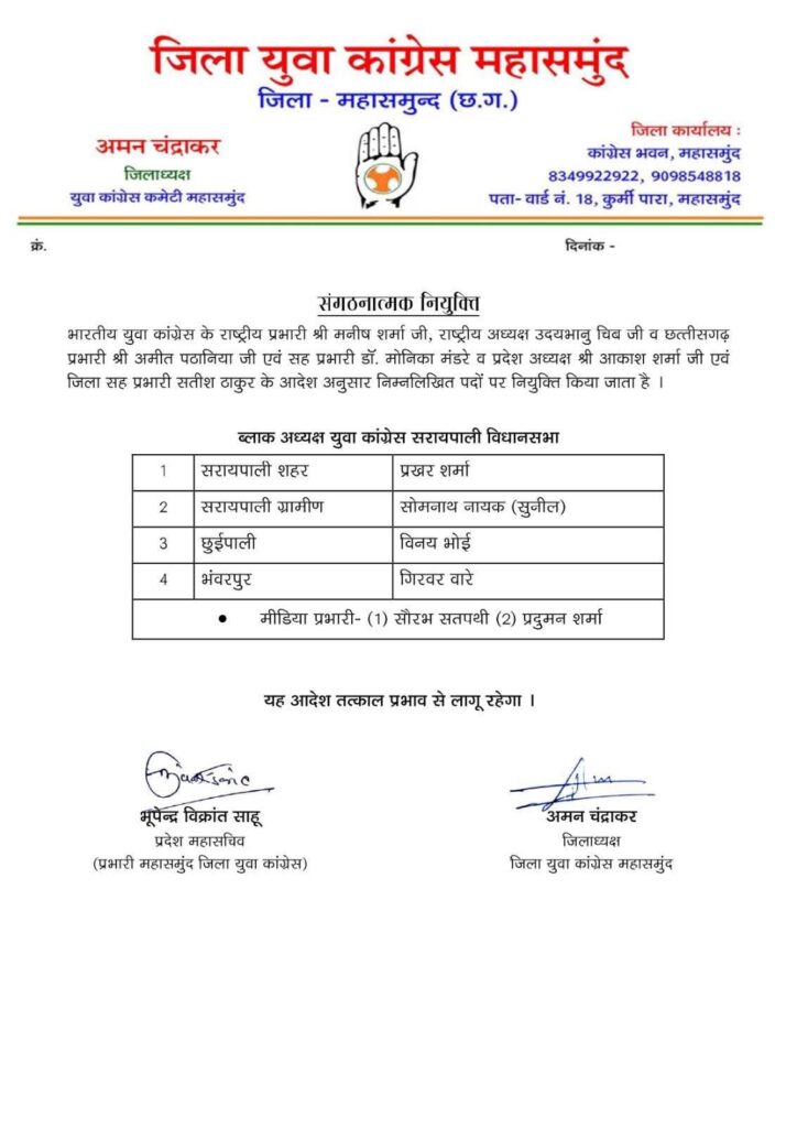 इन नियुक्तियों के अंतर्गत सरायपाली विधानसभा से युवा नेता संजय चौधरी को महासमुंद जिला युवा कांग्रेस का जिला उपाध्यक्ष की जिम्मेदारी दी गयी है, वहीं लोकेश चौधरी को जिला सचिव की जिम्मेदारी सौंपी गई है।