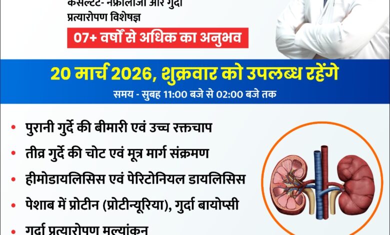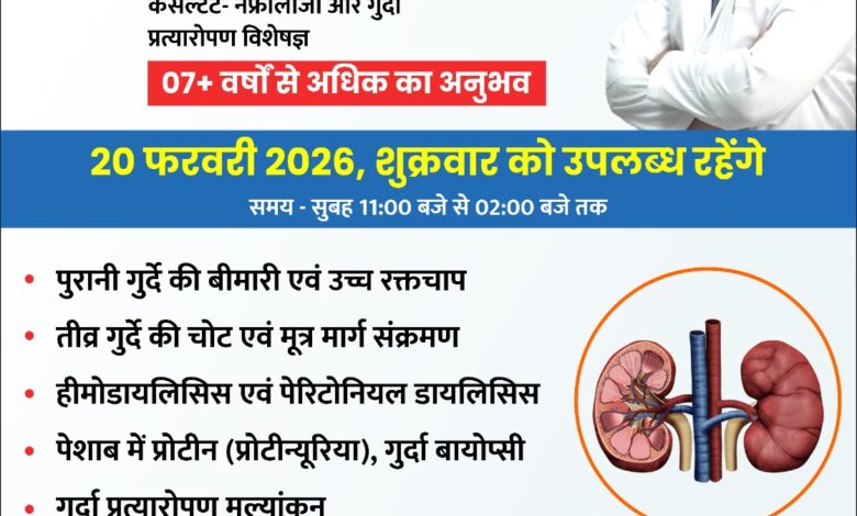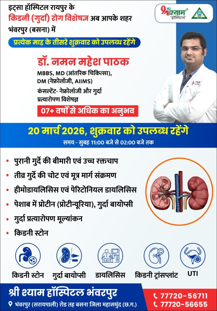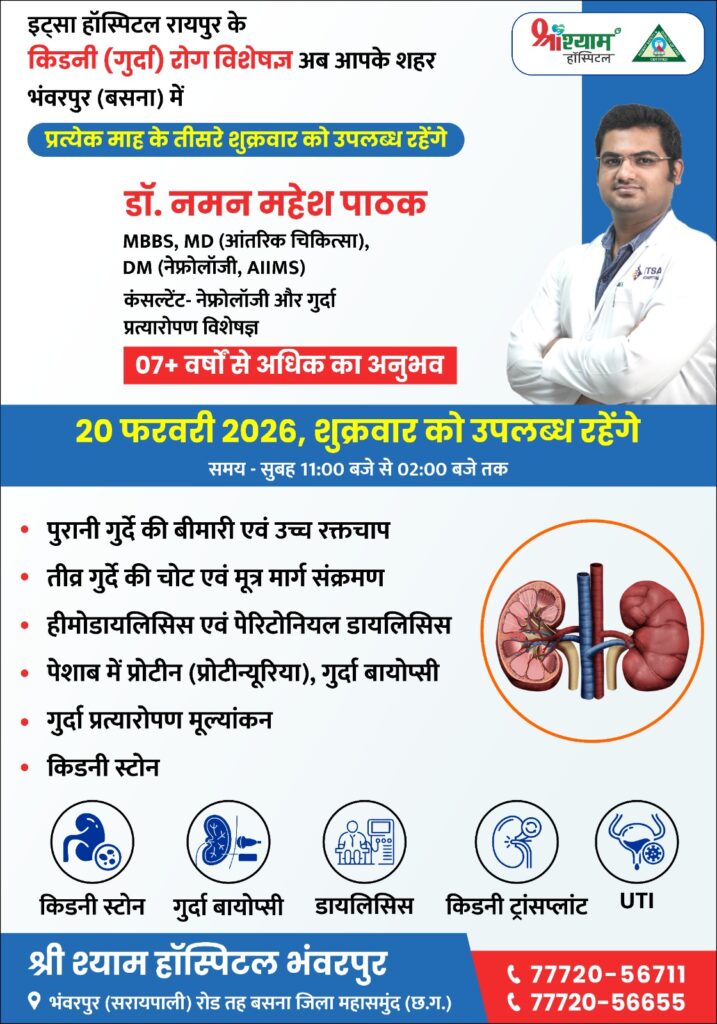 क्षेत्र के मरीजों को अब किडनी से संबंधित गंभीर बीमारियों के इलाज के लिए रायपुर या बड़े शहरों के चक्कर नहीं काटने पड़ेंगे। भंवरपुर स्थित श्री श्याम हॉस्पिटल में डॉ. पाठक प्रत्येक माह के तीसरे शुक्रवार को मरीजों के परामर्श और उपचार के लिए उपलब्ध रहेंगे।