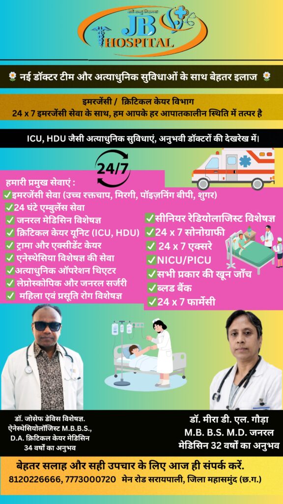 ‘सर्वे सन्तु निरामयाः’ के ध्येय वाक्य के साथ, JB HOSPITAL सरायपाली और आसपास के क्षेत्र में स्वास्थ्य सेवाओं के नए मानक स्थापित कर रहा है।