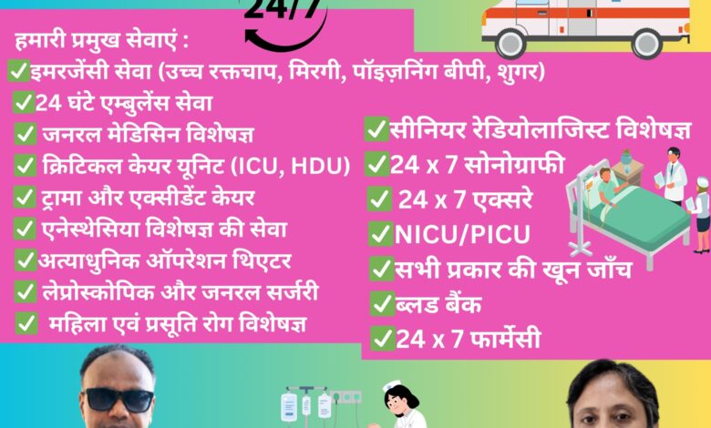 - 24 घंटे एम्बुलेंस, सोनोग्राफी, एक्सरे और फार्मेसी।