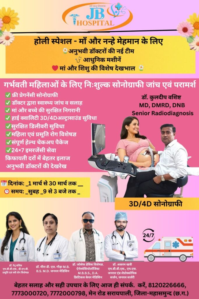 सरायपाली (महासमुन्द) : होली के पावन अवसर पर सरायपाली स्थित JB हॉस्पिटल द्वारा माँ और नन्हे मेहमानों की सेहत को समर्पित एक विशेष स्वास्थ्य पहल की शुरुआत की गई है। ‘होली स्पेशल’ अभियान के तहत अस्पताल में 1 मार्च से 30 मार्च तक गर्भवती महिलाओं के लिए निःशुल्क सोनोग्राफी जांच एवं डॉक्टरी परामर्श की सुविधा प्रदान की जा रही है।