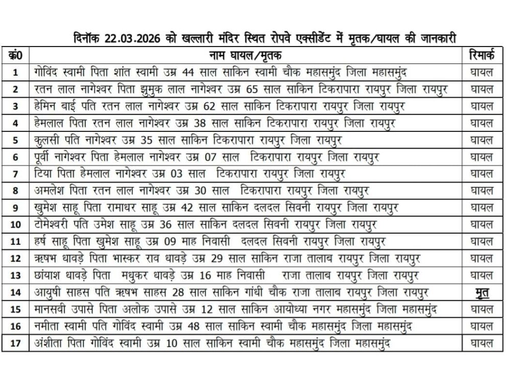 अनुविभागीय अधिकारी नमिता मारकोले के अनुसार घायलों में- गोविंद स्वामी, नमिता स्वामी, अंशुका स्वामी (महासमुंद),हेमलाल नागेश्वर, रतन नागेश्वर, हेमिन, हुलसी, पूर्वी, टिया, अमलेश (टिकरापारा, रायपुर),टोमेश्वरी साहू, कुमेश साहू, हर्ष साहू (दलदल सिवनी, रायपुर),ऋषभ धावरे, छ्यांश, मनस्वी (राजा तालाब, रायपुर) है। वही राजा तालाब निवासी एक महिला नाम आयुषी की मौत हो गई है।