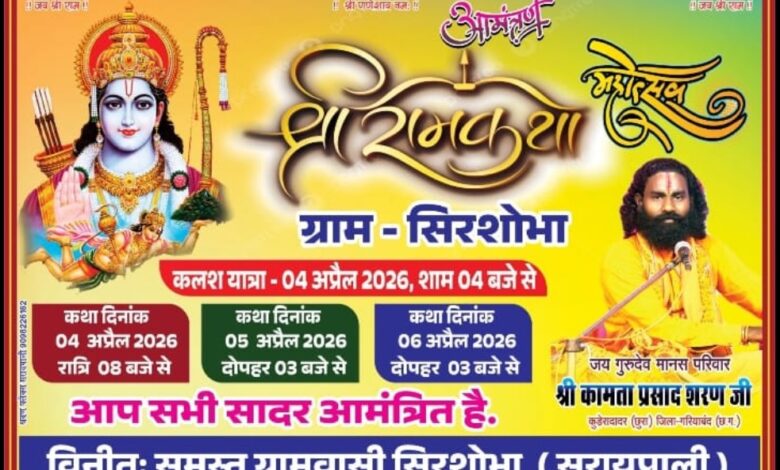 सरायपाली : ग्राम सिरशोभा में धार्मिक एवं आध्यात्मिक वातावरण के मध्य श्री राम कथा महोत्सव का आयोजन बड़े ही श्रद्धा और उत्साह के साथ किया जा रहा है। यह तीन दिवसीय आयोजन 4 अप्रैल 2026 से प्रारंभ होकर 6 अप्रैल 2026 तक चलेगा।