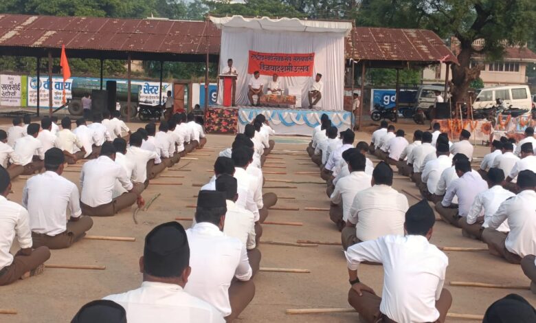 सरायपाली: प्रतिवर्ष की भांति इस वर्ष भी राष्ट्रीय स्वयंसेवक संघ द्वारा विजयादशमी उत्सव अत्यंत ही उत्साह के साथ मनाया गया। नगर के पुरानी मंडी में आयोजित कार्यक्रम के मुख्य अतिथि के रुप में गिरधारी साहू संभागीय अध्यक्ष कोलता समाज थे। मुख्य वक्ता प्रांत शारीरिक शिक्षण प्रमुख विश्वास जलताड़े थे। मुख्य वक्ता ने स्वयं सेवकों को संबोधित करते हुए कहा कि संघ का कार्य ईश्वरीय कार्य है। संघ का कार्य सतत चलने वाला कार्य है जब तक भारत विश्व में सिरमौर नहीं बन जाता, तब तक यह कार्य अनवरत चलते रहेगा। उन्होंने कहा कि हमारा उद्देश्य किसी को डराना धमकाना नहीं है बल्कि हमारा ध्येय है सर्वे भवन्तु सुखिन:का अनुसरण करना है। वसुधैव कुटूम्बकम का भाव होने चाहिए यह दृष्टि हमारी है संघ इसके लिए विगत 100 वर्षों से कार्य कर रहा है। हम सब सौभाग्यशाली हैं कि संघ के 100 वर्ष पूर्ण होते हुए अपनी आंखों से देख रहे हैं। जब तक समाज एकजुट नहीं होगा तब तक हमारी शक्ति पूरी नहीं होगी। उन्होंने कहा कि संघ को जानने समझने के लिए एक घंटे की संघ की शाखा में आना होगा। तभी हम संघ को अच्छे से जान सकते हैं। जहां भी संकट का समय होता है संघ के स्वयंसेवक सदैव तत्पर रहते हैं। इसका उदाहरण कोरोना काल में देश के लोग अपनी आंखों से देख चुके हैं।
