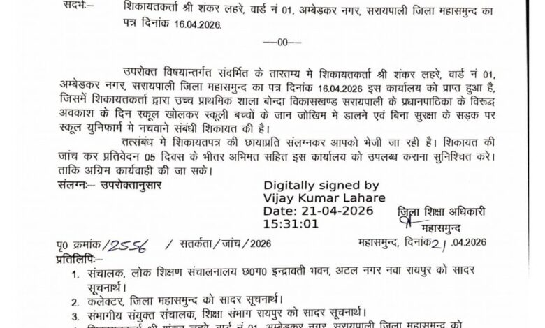 गणवेश धारी स्कूली बच्चों को चिलचिलाती कड़ी धूप में बिना सुरक्षा से बीच सड़क में नचवाया गया। सेवानिवृत्त हुए शिक्षक भोजराज पटेल महाराज की तरह खुली जीप गाड़ी में बैठ कर सब बच्चों का नाचने का मज़े लें रहा था। महत्वपूर्ण यह है कि जिस बीच सड़क में नाबालिग स्कूली बच्चों को नचवाया जा रहा था, वह सड़क सरायपाली-सारंगढ़ रोड़ जिसमें भारी वाहनों का आवागमन होता है। इस घटना की जिम्मेदारी प्रधान पाठिका पदमिनी कुमार को अवकाश के दिन स्कूली बच्चों को गणवेश में आने और स्कूल का चाबी क्यों दिया गया पूछा गया तो चुपी साध लिया गया क्योंकि स्वाभाविक सी बात है किसी भी शासकीय स्कूल का चाबी वहां के बाहर सड़क प्रधान पाठक या प्रधान पाठिका का के पास होता है। यहां प्रश्न अनेक खड़े होते हैं पहला शासकीय अवकाश के दिन स्कूल गणवेश में आने का मौखिक आदेश किसके द्वारा दिया गया ? दूसरा भारी वाहन के अवगमन सड़क बिना सुरक्षा के चिलचिलाती कड़ी धूप में नाबालिक बच्चों को नचवाने की जिम्मेदार कौन है ? तीसरा प्रधान पाठिका पदमिनी कुमार के द्वारा अवकाश के दिन बच्चों को नचवाने या कोई विदाई कार्यक्रम रखने के लिए बिना उच्च अधिकारियों के अनुमति से क्यों रखा गया ? चौथा किसी भी स्कूल का चाबी शासकीय अवकाश के दिन भारसाधक प्रधान पाठक या प्रधान पाठिका के पास होता है, क्या चाबी उच्च अधिकारियों की अनुमति से दिया गया था यदि दिया गया है तो उच्च अधिकारियों का आदेश कॉपी प्रधान पाठिका पदमिनी कुमार के पास है क्या ? पांचवां किसी नाबालिक स्कूली बच्चे का सड़क दुर्घटना हो जाती तो इस आपरी घटना की जिम्मेदार कौन होता ? छठवां छत्तीसगढ़ सिविल सेवा (आचरण) अधिनियम 1965 के अनुसार सेवानिवृत्त सेवक को विदाई समारोह कार्यक्रम शालीनता पूर्वक किया जाना है, स्कूली बच्चों को सड़क में बिना सुरक्षा से सिलसिलाते कड़ी धूप पर नचवाना नियमों का घोर उल्लंघन है। इस संदर्भ में अनेक बिंदुओं पर वार्ड नंबर एक, अंबेडकर सरायपाली निवासी शंकर लहरे ने जिला शिक्षा अधिकारी महासमुन्द को लिखित शिकायत किया। जिसमें कार्यालय जिला शिक्षा अधिकारी आदेश क्रमांक./2555/सतर्कता/जांच/2026 जारी आदेश महासमुंद दिनांक 21/04/2026 कों जारी कर जितेन्द्र कुमार बुडेक प्राचार्य शासकीय उच्चतर माध्यमिक विद्यालय बिछिया विकासखंड बसना को जांच अधिकारी नियुक्त किया गया है। अब देखना है यह दिलचस्प होगा की जांच में कौन सा तथ्य सामने आता है और किन-किन शासकीय सेवकों के ऊपर कार्यवाही की गाज गिरती है।