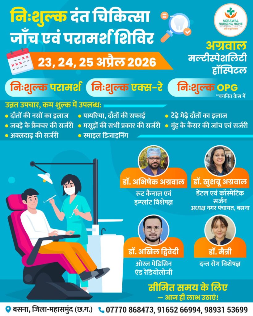 बसना : क्षेत्र के प्रसिद्ध स्वास्थ्य संस्थान ‘अग्रवाल मल्टीस्पेशलिटी हॉस्पिटल’ (अग्रवाल नर्सिंग होम) में आगामी 23, 24 और 25 अप्रैल 2026 को एक विशाल निःशुल्क दंत चिकित्सा एवं परामर्श शिविर का आयोजन किया जा रहा है।