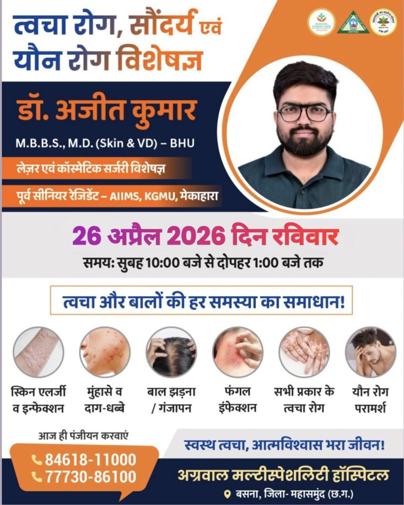 बसना : क्षेत्र के मरीजों को त्वचा, सौंदर्य और यौन रोगों से संबंधित परामर्श के लिए अब बड़े शहरों के चक्कर नहीं काटने पड़ेंगे। बसना स्थित अग्रवाल मल्टीस्पेशलिटी हॉस्पिटल में आज, 26 अप्रैल 2026 (रविवार) को देश के प्रतिष्ठित संस्थानों के अनुभवी विशेषज्ञ डॉ. अजीत कुमार अपनी सेवाएँ देंगे।