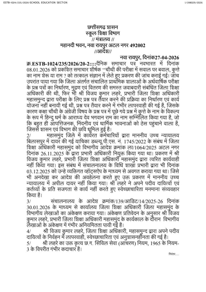 महासमुंद : छत्तीसगढ़ शासन के स्कूल शिक्षा विभाग ने एक बड़ा कदम उठाते हुए महासमुंद जिले के प्रभारी जिला शिक्षा अधिकारी (DEO) विजय कुमार लहरे को सस्पेंड कर दिया है। यह कार्रवाई धार्मिक भावनाओं को ठेस पहुँचाने और विभागीय कार्यों में गंभीर लापरवाही बरतने के चलते की गई है।
