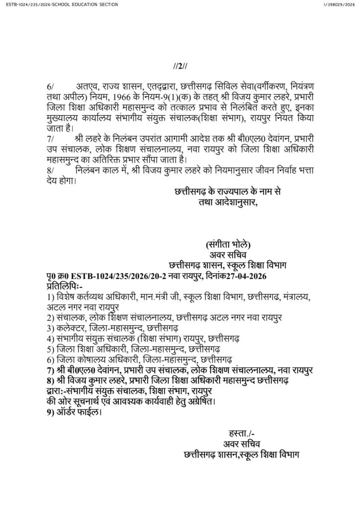निलंबन की अवधि के दौरान श्री लहरे का मुख्यालय संभागीय संयुक्त संचालक (शिक्षा संभाग), रायपुर नियत किया गया है। वहीं, महासमुंद जिला शिक्षा अधिकारी का अतिरिक्त प्रभार श्री बी.एल. देवांगन (प्रभारी उप संचालक, लोक शिक्षण संचालनालय) को सौंपा गया है।