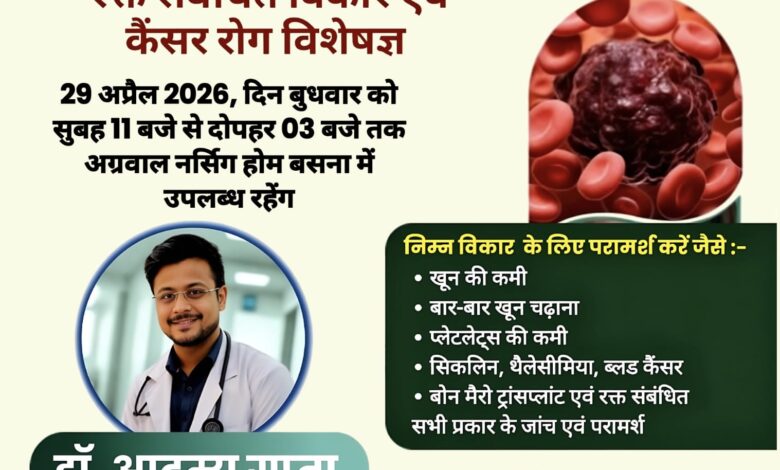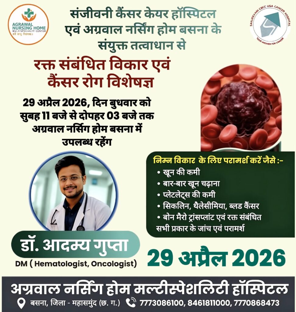 बसना : क्षेत्र के प्रसिद्ध चिकित्सा संस्थान अग्रवाल नर्सिंग होम मल्टीस्पेशलिटी हॉस्पिटल द्वारा संजीवनी कैंसर केयर हॉस्पिटल के संयुक्त तत्वाधान में एक विशेष चिकित्सा शिविर का आयोजन किया जा रहा है। इस शिविर में देश के विख्यात रक्त संबंधित विकार एवं कैंसर रोग विशेषज्ञ (Hematologist & Oncologist) डॉ. आदम्य गुप्ता (DM) अपनी सेवाएँ देंगे।