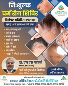 महासमुंद/सरायपाली: अग्रवाल नर्सिंग होम बसना में में प्रतिदिन सुबह 10 से शाम 07 बजे तक निःशुल्क चर्म रोग शिविर का आयोजन रखा गया है।