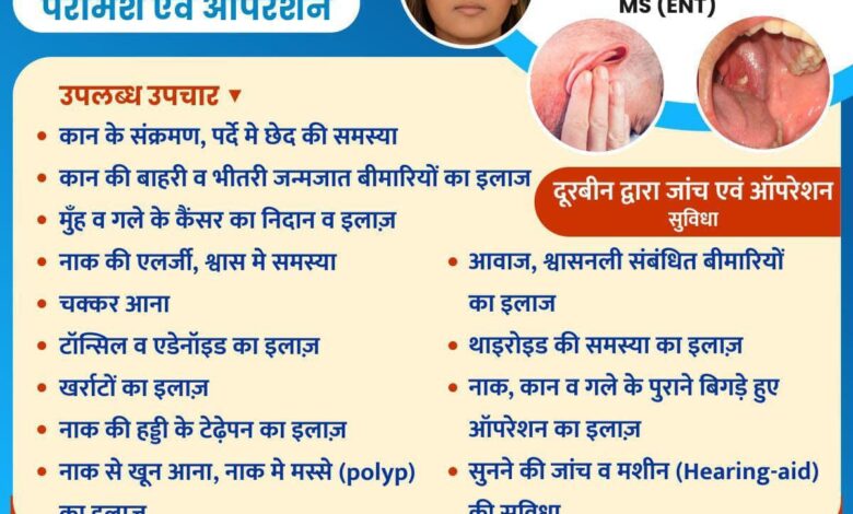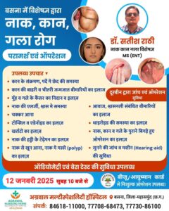 नाक कान गला रोग विशेषज्ञ डॉक्टर सतीश राठी 12 जनवरी को अग्रवाल नर्सिंग होम बसना में उपलब्ध रहेंगे